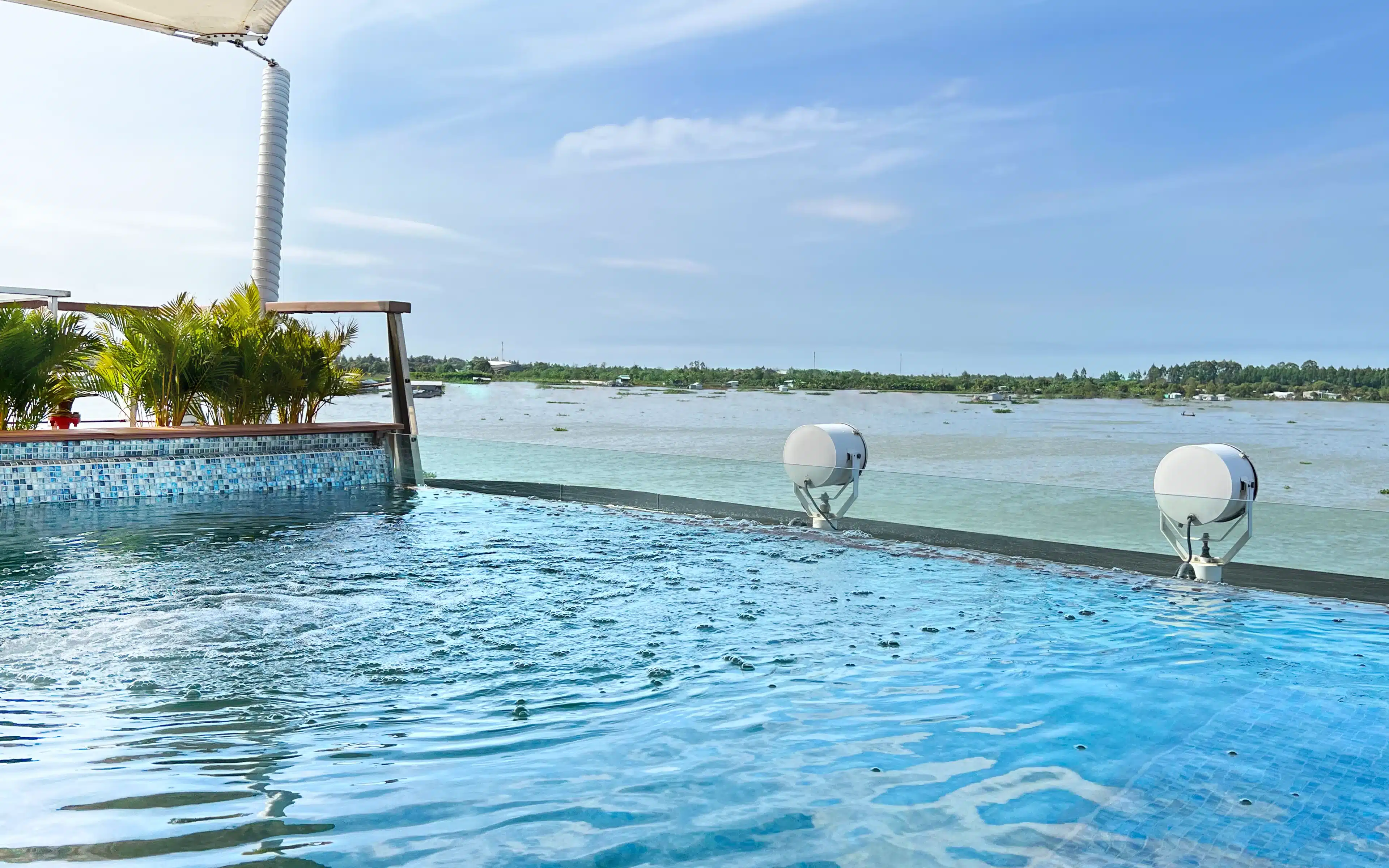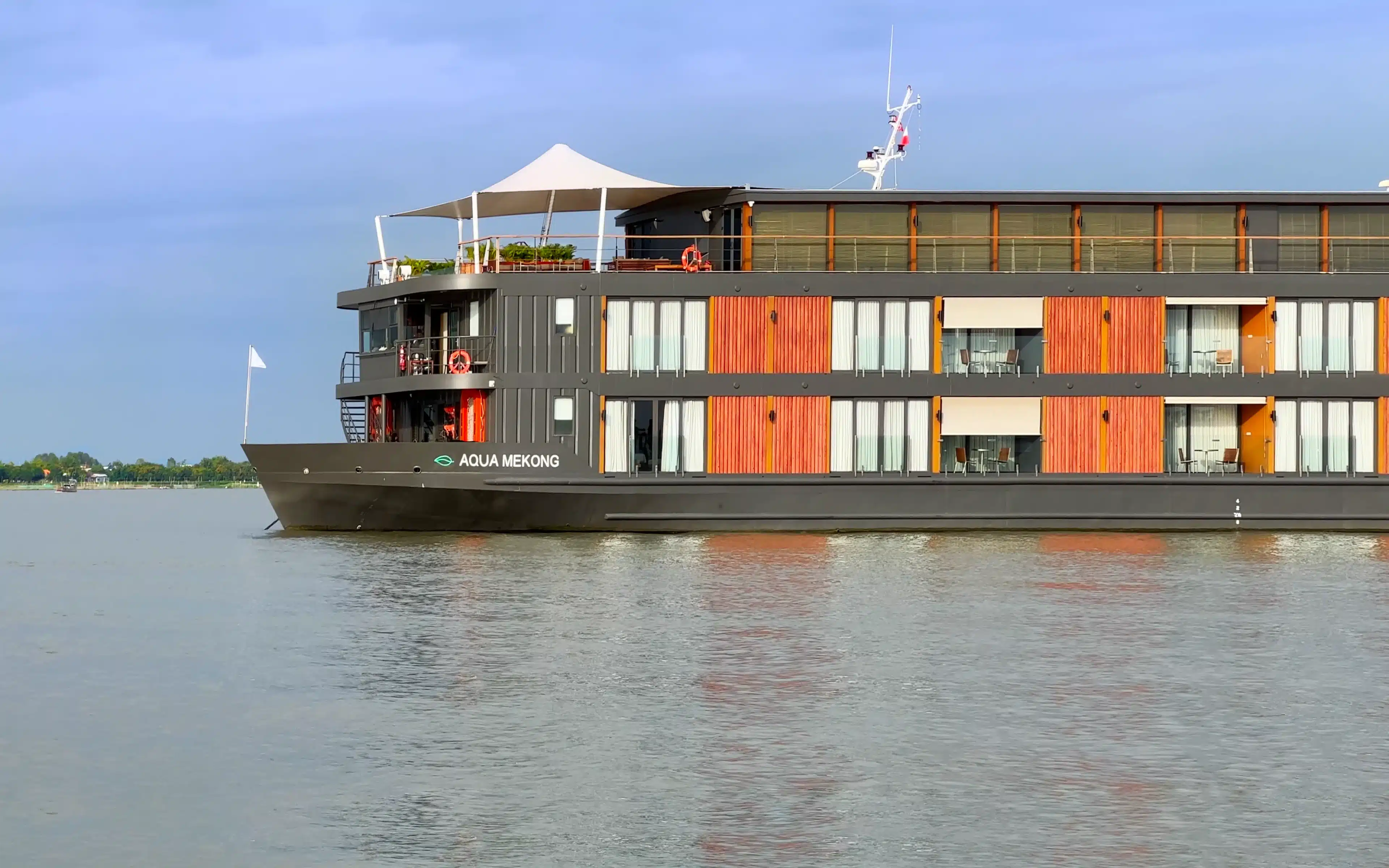 The outside space of an Aqua Mekong Balcony Suite is a real treat. The balcony is extra large, with room for an outdoor dining setting.